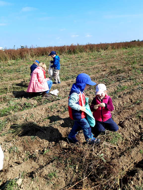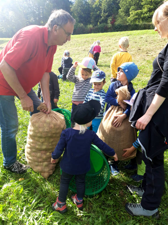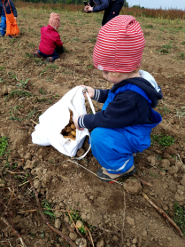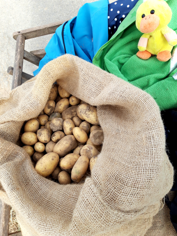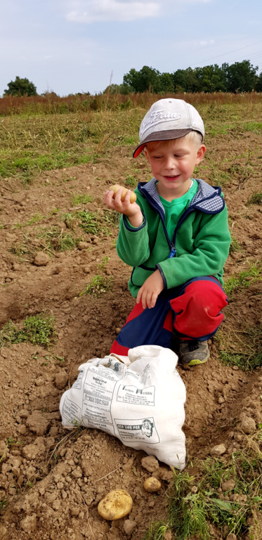Auf dem Bodemer Hof in Ehningen konnten wir, nachdem der Kartoffelernter seine Arbeit beendet hatte, die liegengebliebenen Kartoffeln aus dem Acker lesen. Einen großen Sack voll schönster Kartoffeln haben wir aufgelesen und den schweren Sack dann in unserem Bollerwagen zurück zum Treffpunkt transportiert. Jedes Kind durfte seinen mitgebrachten Beutel füllen, um zuhause Bratkartoffeln, Kartoffelbrei, Kartoffelsalat, Pommes … zuzubereiten. Und immer noch sind viele Kartoffeln übrig, die wir zum Ende der Erntezeit bei einem Kartoffelfeuer rösten werden.