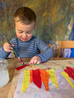 Die neuen Waldwichtel haben ihre Laterne gewerkelt: Rotes, orangefarbenes und gelbes Transparentpapier reißen und mit Kleister auf das Papier kleben. Für das Ausschneiden der Kinder, die sich rund um die Feuerstrahlen reihen, hatten die kleinen Raben Hilfe von einem großen Bärenkind. Schön sind sie geworden und dann freuten wir uns auf den Laternenlauf durch den dunklen Nächstenwald.