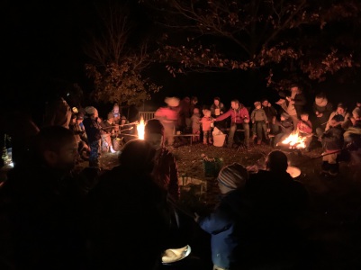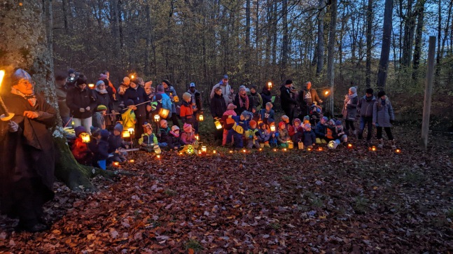 Dann war es endlich so weit, an einem späten Nachmittag leuchteten an unserem Bauwagenplatz die unterschiedlichsten Laternen um die Wette. Nach einem gemeinsamen Lied, zur Einstimmung, setzte sich der Zug in Richtung Niederseilparcours in Bewegung. Dort erwartete alle kleinen und großen Waldwichtel die Legende von St. Martin, der in einer kalten Novembernacht seinen Mantel teilt. Und St. Martin war tatsächlich auf einem echten Pferd auf den Platz gekommen. Er führte es langsam in Richtung des Stadttors von Amiens, da der Boden gefroren war und er nicht wollte, dass sein treues Pferd zu Schaden kam, während sein Kamerad bereits eilig vorausgeeilt war, um im warmen Gasthaus Unterschlupf zu finden. Doch an der Stadtmauer wollte Martins Pferd nicht weiterlaufen und schließlich entdeckte Martin den Grund. Eine Gestalt, in Lumpen gehüllt, kauerte dort in der Kälte. Ohne zu zögern zog Martin sein Schwert und teilte seinen warmen Mantel mit der frierenden Bettlerin. Der Wächter am Stadttor, mit der brennenden Fackel in der Hand, ließ dann auch Martin nach Amiens einreiten … Ihr kennt die Geschichte und wir kennen sie auch - sehr gut sogar. Aber trotzdem hören und sehen wir sie immer wieder gerne. Anschließend zogen wir weiter durch den immer dunkler werdenden Nächstenwald und Lichterkreise auf dem Weg markierten unsere Singstationen. Nach der langen Runde erwarteten uns am Bauwagenplatz brennende Feuerschalen, über denen wir zum Abschluss des Abends unsere mitgebrachten Würste grillten. Am wolkenlosen Himmel leuchteten Sterne und hier unten leuchteten wir