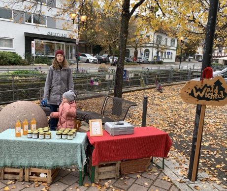 77 Flaschen, mit selbst gepresstem Apfelsaft, konnten wir eine Woche später, auf dem Aidlinger Rathausplatz, im Laufe des Vormittags komplett verkaufen. Wir freuen uns, dass so viele Besucher an unseren Verkaufsstände vorbei geschaut haben!