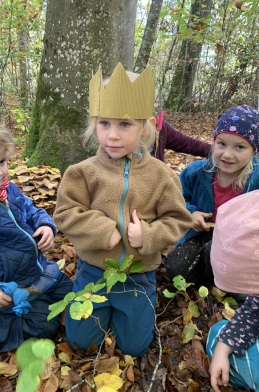 Auch die Geschichte vom Kartoffelkönig wurde noch einmal gehört und nachgespielt: Der Kartoffelkönig, der so groß war wir 12 andere dicke Kartoffeln zusammen, von der Großmutter aber nicht gegessen werden wollte. Er sprang ihr aus dem Körbchen, begegnete Igel Stachelfell, Wildschwein Grunznickel, Has Langohr und der Hexe Tannenmütterchen. Aber keiner durfte ihn verspeisen. Als er aber ein paar armen Kindern begegnete, deren Bäuche vor Hunger knurrten, sprang er “hopps” in ihr Körbchen und sie bekamen eine dicken, fetten Reibekuchen, des Mittags zu Haus. Auf dem Foto seht ihr Magdalena als Kartoffelkönig.