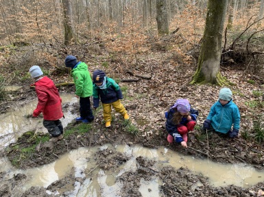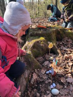 Gleich zu Beginn des Monats stand das Osternfest an und damit unsere Osterfeier. Und an diesem Tag zeigte sich der April von seiner sonnigen Seite. Sie strahlte vom blauen Himmel - welch ein Glück. Wir hatten mit dem Osterhasen besprochen, wo wir unsere bunten Osterstecker, jeder mit dem Namen eines Waldwichtels versehen, aufstellen würden. Dort sollte er bitte seine Überraschungen für uns verstecken. Und so ging es gleich nach dem Morgenkreis an den Platz „Hinter der Rakete“ und die Ostereier Suche begann. Manche hatten ihr kleines Moos Nestchen, mit dem bunten Ei und zwei Süßigkeiten, schnell gefunden, andere suchten etwas länger. Aber am Ende hatten natürlich alle ihre Osterhasen Überraschung in den Händen. Die Karotte, die wir zur Stärkung des Osterhasen am Vortag bereit gelegt hatten, war angeknabbert. Er hat sich also über den kleinen Imbiss gefreut.