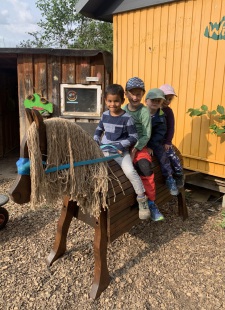 Und dann konnten einige aus unserer Waldwichtel Runde auch noch auf echten Pferden sitzen. Beim Ausflug zu Angelas kleinem Reitstall, konnten wir am Ende des zweistündigen Besuches, wieder eine Runde auf Vinja und Gydja reiten. Zum ersten Mal seit vier Wochen war es nass von oben, aber nichtsdestotrotz, genossen wir die große Runde auf den Pferderücken.