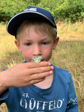 Rund um unseren Bauwagenplatz sehen wir ab dem Frühling viele bunte Tagfalter flattern. Der erste Gast ist in jedem Jahr, an sonnigen Märztagen, der Zitronenfalter. „Kleiner Fuchs“ und „Tagpfauenauge“, legen im April ihre Eier am großen Brennnesselfeld auf dem Erdhügel ab. Wir können die Entwicklung von den Eiern, über die Raupen, zu den Puppen, beobachten. Bis schließlich, an einem sonnigen Tag, ein bunter Falter über das Brennnesselfeld, dem blauen Himmel entgegen flattert. In der Igelgruppe haben die „Mittleren“ der Waldwichtel vergangene Woche auch bunte Schmetterlinge gewerkelt: Aus Kaffeefiltern, mit Hilfe von Filzstiften und Wasser, entstanden fröhlich bunte Flatterlinge. Die buntbemalten Kaffeefilter-Flügel wurden mit der tollen Wasserspritze von Regina kräftig befeuchtet. Die Farben flossen ineinander und die warme Junisonne trocknete alles schnell. Ein bunter Pfeifenputzer als Fühler, und fertig war der Schmetterling, der mit nach Hause reisen durfte!