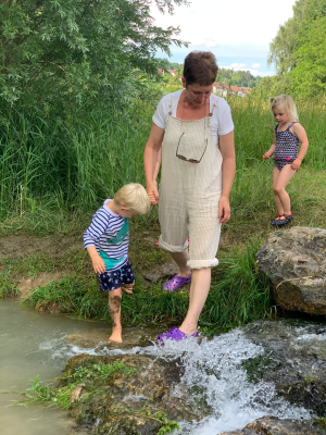 Die heißen Temperaturen haben wir auch genutzt, um unseren Lieblings Bachplatz, am Ortseingang Gechingen, zu besuchen: Pünktlich um 10 Uhr waren wir an der Bushaltestelle „Bergweg Dachtel“. Von dort ging es eine Station auf Rädern, bis zum Spielplatz Bergwaldsiedlung. Nun zu Fuß bergab zur Bachstelle in der Nähe der Kläranlage. Im Gepäck alles, was für einen ordentlichen Bachvormittag wichtig ist: Badehosen, Badetücher, Taucherbrillen, Kescher, Eimer und Wasserspritzen. Und dann haben wir es uns am Bach gemütlich gemacht, die Handtücher ausgebreitet, Badekleidung angelegt und erst einmal, die Vesperdosen geöffnet. Frisch gestärkt konnte geplantscht werden. Ziemlich kühl war das Wasser noch, aber richtige Wasserratten haben damit kein Problem. Sogar Köcherfliegenlarven konnten wir am Grund des Bachbeckens finden und unter die Lupe nehmen. Wir hatten einen tollen Vormittag am Wasser und es war sicher nicht der letzte Bachausflug in diesem Sommer!