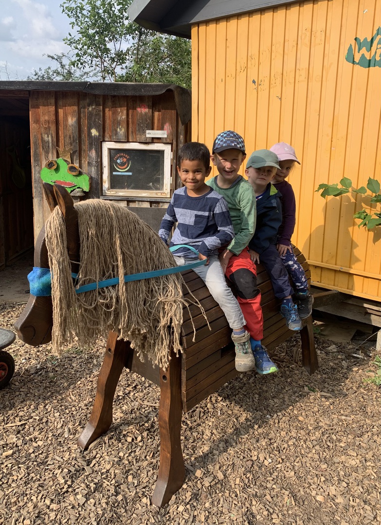 Ja, leider ist es bald schon wieder so weit, vier Waldwichtel werden im September vom Kindergarten in die Schule wechseln. Dass dieser Abschied nicht mehr in allzu ferner Zukunft liegt, haben wir am vergangenen Montag bemerkt. Als wir am Morgen unseren Bauwagenplatz betraten, begrüßte uns, neben allen vertrauten Dingen, ein Pferd. Kein echtes, nein, eines aus Holz gebaut. Entstanden ist es unter den Händen aller Bäreneltern, deren Kinder in diesem Jahr in die Schule wechseln. Und nicht nur für die Kinder, auch für die Eltern von Bella, Lisa, Bruno und Karl heißt es Abschied nehmen vom Waldkindergarten, der für alle, über viele Jahre, ein sehr vertrauter Ort war. Wir haben uns riesig gefreut, zukünftig, neben unseren Baumhäusern und der Freiluftküche, auch noch ein Pferd bespielen zu können. Danke schön an Familie Hierholzer, Zipperle, Kriegseis und Steiger, für die Zeit, die sie in das Pferd gesteckt haben.