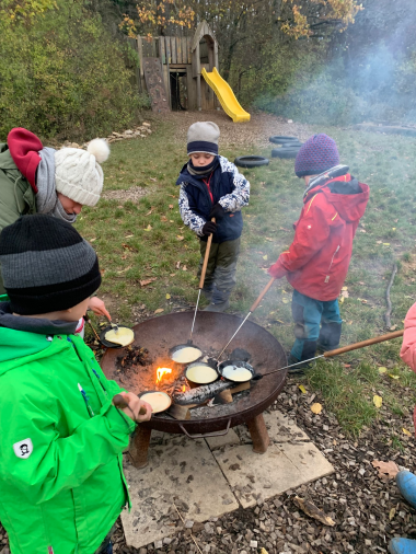 Zur Einstimmung haben die zehn Vorschul-Bärenkinder bereits ein paar Tage vor dem Laternenfest einen Fackelabend erlebt. Zuerst wurden an späten Nachmittag Pfannkuchen in der Feuerschale ausgebacken und im eingeheizten Bauwagen gegessen. Um 17:30 Uhr, als es dunkel genug war, entzündeten wir die Fackeln. Es war aufregend und gemeinsam zogen wir über die angrenzenden Wiesen und durch den Wald, vorsichtig und achtsam … Ein klein wenig war es auch unheimlich, unseren vertrauten Wald nur wenig erleuchtet zu erleben. Doch am Ende waren sich alle einig, das war ein super toller Abend. Emil's Urteil: „Es war der beste Abend, den ich je erlebt hab!“Na, das will doch was heißen!
