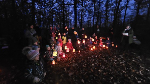 Mitte des Monats war es dann endlich soweit, das Laternenfest stand an. Der Vormittag war sehr wechselhaft gewesen und ein wenig bangten wir, ob es am späten Nachmittag trocken bleiben würde. Aber, wir hatten, wie schon so oft, großes Wetterglück. Ein fast wolkenloser Spätnachmittagshimmel spannte sich über uns, als wir nach einer kleinen Mittagspause alle wieder am Bauwagenplatz zusammentrafen. Wir entzündeten die Laternen und sangen ein erstes gemeinsames Lied. Nun ging es weiter zum Niederseilparcour, wo alle großen und kleinen Waldwichtel ein Schattenspiel erwartete. Die Legende von St. Martin, mit der wir uns in den Tagen zuvor schon viel beschäftigt hatten, wurde von Helen noch einmal erzählt und auf dem weißen Tuch, das zwischen zwei Bäume gespannt war, sahen wir St. Martin auf seinem Pferd, den Bettler und einen Torwächter mit Fackel. Dafür ein großes Dankeschön an Benno und Liselotte, die uns hier tatkräftig unterstützt haben. Weiter ging es durch den dunklen Nächstenwald, der von unseren vielen bunten Laternen erleuchtet wurde.
