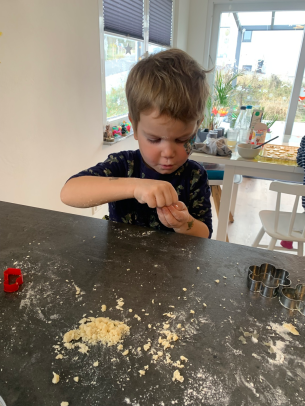 Die Plätzchendosen sind gefüllt, der Adventskranz hängt an der Terrassendecke und Reisigbündel zieren unseren Platz. Wir haben alles vorbereitet für die Wochen bis Weihnachten. In drei Elternküchen wurde Ende November eifrig gebacken. Und da wir, wie ihr wisst, in unserem Waldkindergarten keinen Backofen haben, fand das große Backen bei drei Familien statt. Die Familien Angermair, Carli und Ziegler haben uns für einen halben Vormittag gerne die Türen geöffnet und in kleinen Gruppen wurde gewerkelt: Viele kleine Wichtelhände haben fleißig Teig ausgerollt, Plätzchen ausgestochen, mit Ei bepinselt und mit bunten Streuseln verziert. Die Kekse brauchen wir für unser tägliches Knusperstündchen, das zur Geschichtenzeit stattfindet. Und im kalten Winterwald schmecken die Plätzchen ganz besonders gut.