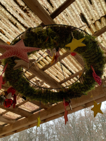 Unseren Adventskranz haben wir mit etwas Moos bestückt und mit vielen bunten Anhängern, aus unserer Adventskiste, geschmückt. Jetzt hängt er an der Terrassendecke und wartet darauf, jeden Tag am langen Seil, herab zu schweben und in der Mitte unseres Morgenkreises für ein wenig Kerzenlicht zu sorgen.