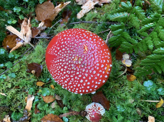 Und der hat den Bäumen, Büschen, Gräsern, Pilzen weiße Schneemützen beschert.