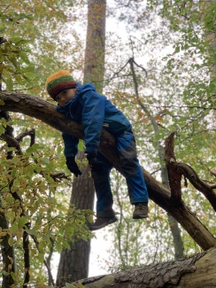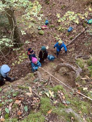 An einem der ersten richtig herbstlich kühlen Tage im Oktober, haben wir einen Abstecher in den Wald zwischen Aidlingen und Gärtringen unternommen. Treffpunkt am Morgen war der Wanderparkplatz in der Nähe der Aidlinger Sportanlagen. Von dort ging es zu Fuß ein Stück entlang der Alten Gärtringer Straße und kurz nach dem Abzweig zum Häckselplatz, bogen wir links ab, in den Herbstwald hinein. Ein schmaler Pfad führte uns unter den bunt belaubten Bäumen bis zu einer Stelle, an der, vor langer Zeit, warum auch immer, ein tiefer, großer Graben entstanden war. Und genau diese Stelle, der wir den Namen „Wichtelschlucht“ gaben, war unser Ziel. Denn wir hatten Lust zu Klettern. Und dafür war dieser Ort perfekt. Ein langes Kletterseil hatten wir mit im Gepäck und befestigten es an einer dicken Buche. Das Ende ließen wir in die „Schlucht“ gleiten und nun konnten wir uns am Seil nach oben hangeln. Muskelkraft war hier gefragt und trotzt der kühlen Temperaturen wurde uns hierbei ganz schnell warm. Eifrig wurde bergan und bergab geklettert und am Ende des Kindergartenvormittages waren wir uns einig, hierher kommen wir bald wieder einmal!