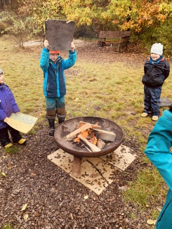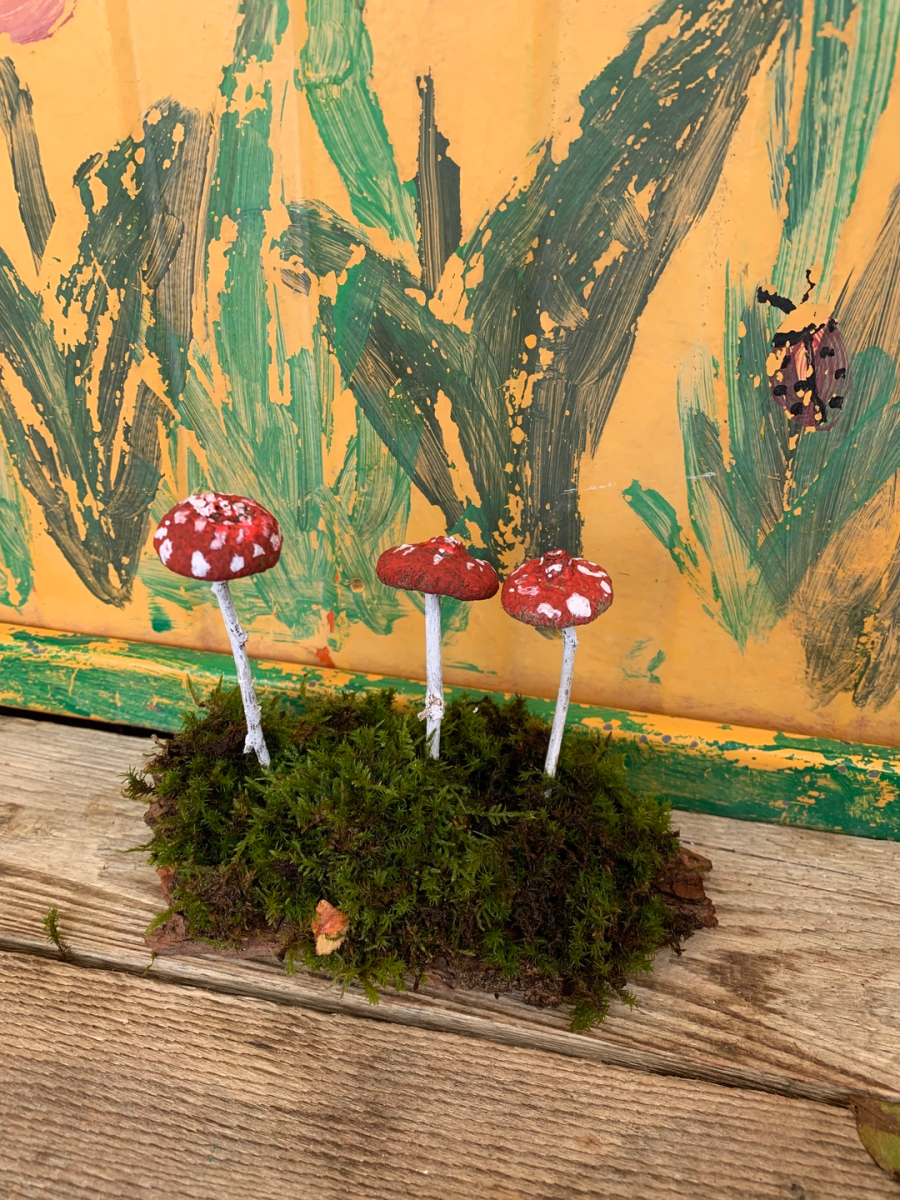 Wie ihr bereits wisst, finden immer Donnerstags die Bären,- Igel,- und Rabengruppe statt. Hier werden wir Waldwichtel in drei Altersgruppen unterteilt und erleben, passend für jedes Alter, ein Angebot, das Helen, Regina oder Petra für uns vorbereiten. Vor den Herbstferien waren wir in der Bärengruppe wieder mal kreativ unterwegs. Aus großen Eichelhütchen, auf kleine Haselnussstiele geklebt und einem Rindenstück, entstand eine kleine, lustige Fliegenpilzrunde. Zuerst konnten wir mit dem Akkubohrer kleine Löcher ins Rindenstück bohren. Dort hinein steckten wir unsere drei Fliegenpilze und begannen mit den Malarbeiten: Mit feinem Pinsel wurde zuerst der Pilzfuß weiß bepinselt, und dann der Hut rot angemalt. Als der im eingeheizten Bauwagen getrocknet war, konnten auch noch die weißen Punkte aufgemalt werden. Jetzt, wenn gewünscht, noch ein wenig Moos auf das Rindenstück und fertig war die kleine, feine Pilzgruppe, die Zuhause mit Sicherheit ein schönes Plätzchen findet.