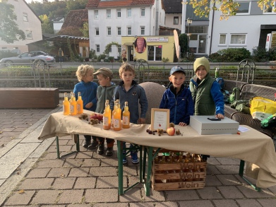 Aber nicht nur Kartoffeln haben wir geerntet. Bereits im September hatten einige Waldwichtel Familien über 100 Apfelsaftflaschen produziert. Und diese vielen Flaschen Saft haben wir dann, Mitte Oktober, auf dem Aidlinger Marktplatz zum Kauf angeboten.