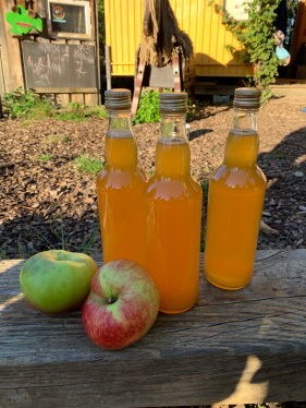 Aber damit nicht genug. Auch Äpfel, die nun bereit zur Ernte sind, haben wir geerntet und daraus über 100 Flaschen Apfelsaft produziert. Viele Familien aus der Wichtelrunde haben sich an einem sonnigen September Samstag auf Regina's Apfelbaumwiese in Gärtringen getroffen. Und viele Säcke voll mit Äpfeln wurden dann zu Franzi und Clara nach Hause transportiert, um dort zu goldgelbem Apfelsaft zu werden. Es war ganz schön viel Arbeit, doch wenn etliche große und kleine Hände anpacken, geht es flott und macht ganz mächtig Spaß.