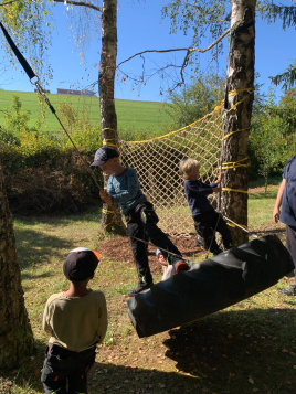 An einem der letzten spätsommerlichen Tage im September, haben wir dann noch das tolle Gartengrundstück von Felix, „Ranch“ genannt, besucht. Wir haben uns sehr darauf gefreut, zuallererst einmal auf die kleine Busfahrt. Denn Bus fahren lieben wir sehr. Zwar war es nur ein kurzes Stück, vom Deurfringer Rathaus, bis zur Furthmühle Aidlingen, aber egal, auch eine Kurzstrecke ist super. Von dort hieß es noch ein kleines Stück wandern, bis unterhalb des Venusberges, wo das tolle Gartengrundstück, hinter Hecken versteckt, liegt. Dort gab es viel Platz zum Toben und Rennen, ein Kletternetz, eine große Reifenschaukel, Kletterbäume, eine Seilbahn und ein phantastisches Feuer, an dem wir Würstchen grillen konnten. Es hat uns an nichts gefehlt und wir hatten ganz viel Spaß. Danke, Felix, für die Einladung und den schönen Kindergartenvormittag auf euerer Ranch!