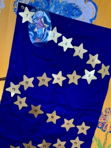 Auf unserem Sternentuch wandert der kleine Engel täglich ein Stück weiter und auf dem beigefügten Foto könnt ihr den „kleinen Engel“ sehen.