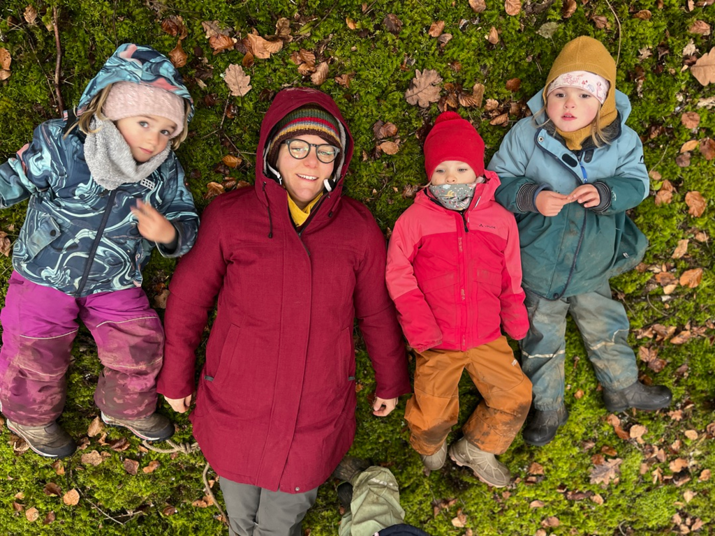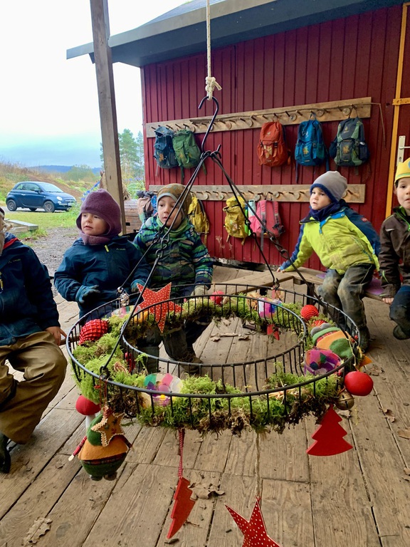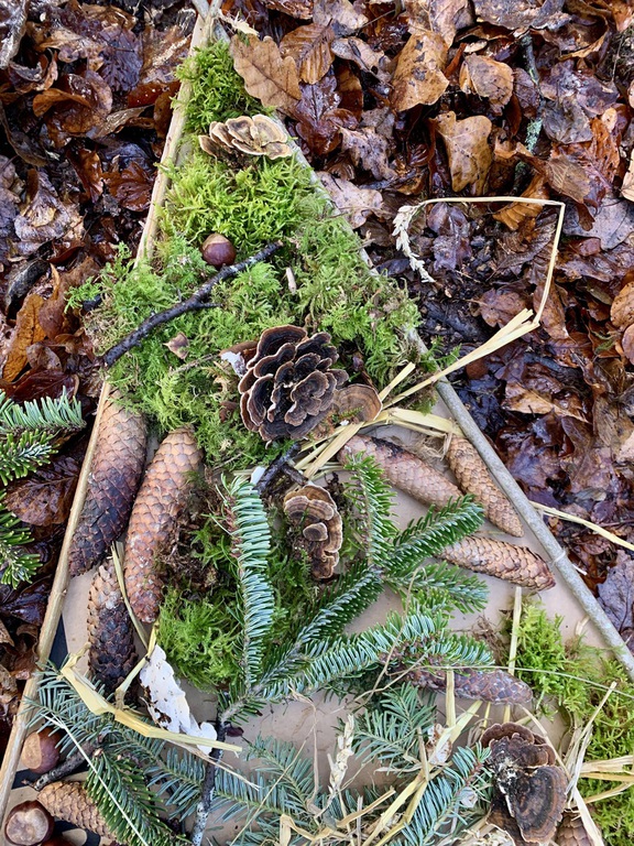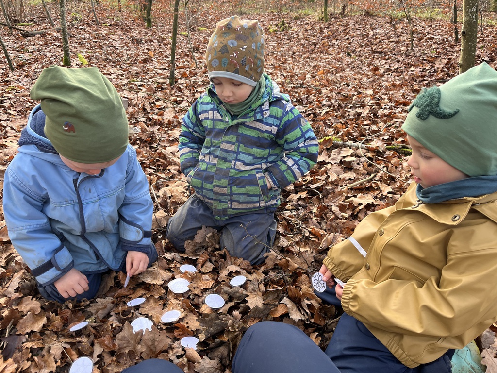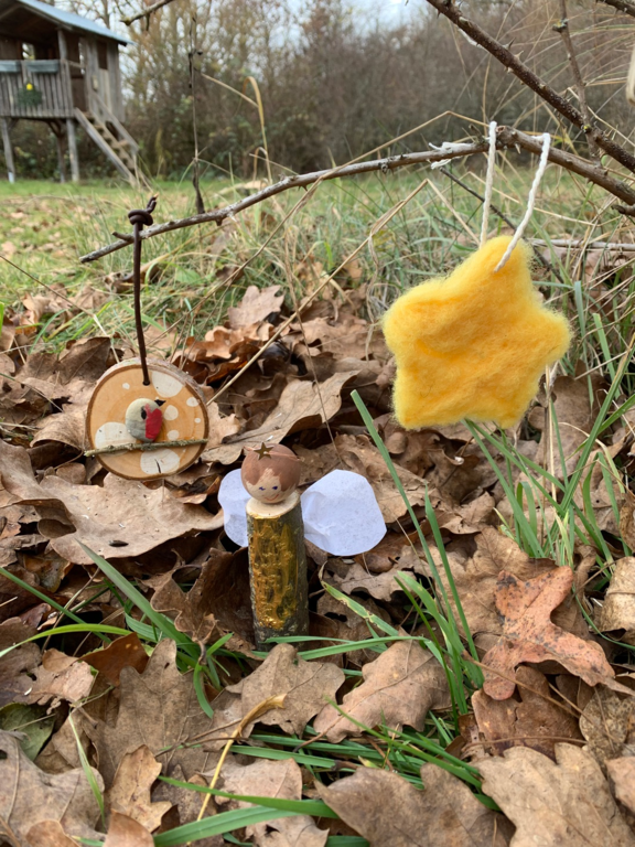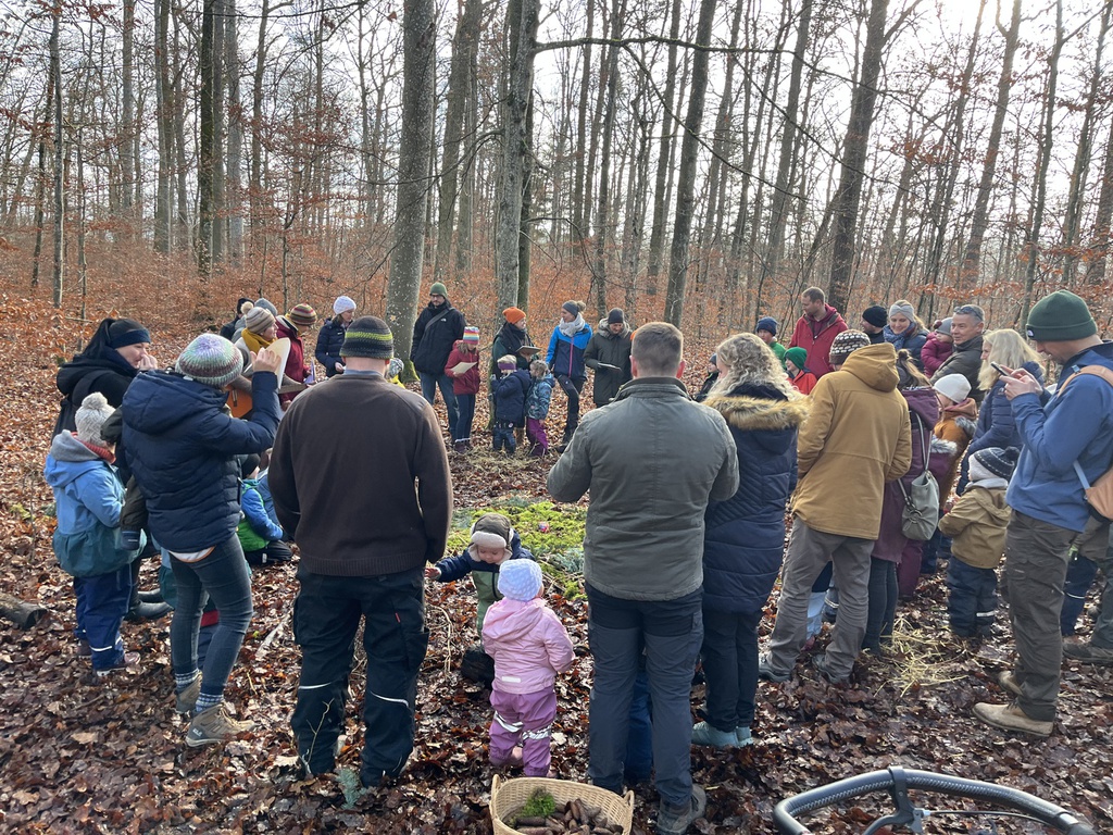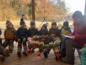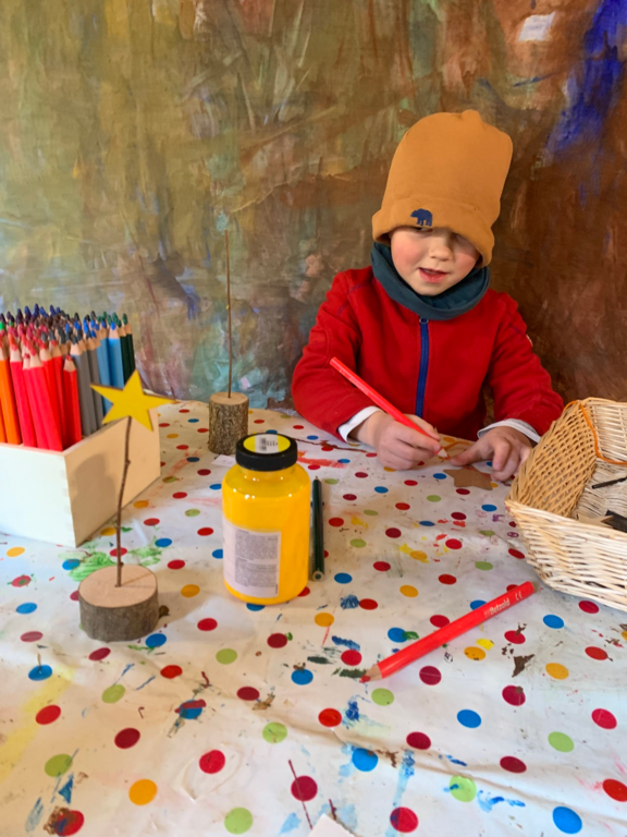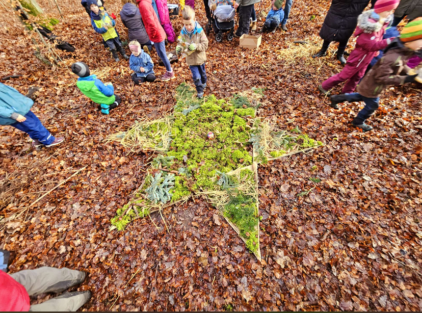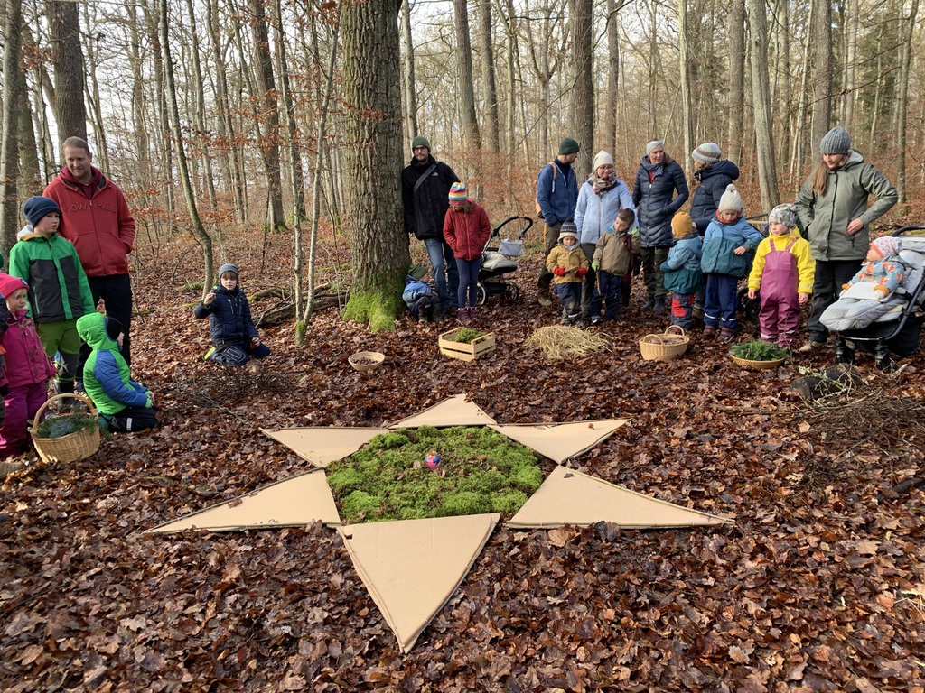 Kein Sturm, kein Regen oder Schnee, perfekte Bedingungen für eine gelungene Waldwichtel Waldweihnacht. Sie stand unter dem Motto „Der Weihnachtsstern er weiß den Weg“ und alle Kinder, Mamas, Papas, Geschwister, Omas und Opas durften sich sehr aktiv beteiligen. Aufgabe war nämlich, die sechs, anfangs noch braunen Sternspitzen am Waldboden, mit vielerlei Naturmaterialien auszuschmücken. Immer zwei Familien fanden über das Stern Memory zusammen und machten sich an die kreative Arbeit. Damit nicht genug, nebenher durfte noch gedichtet werden.