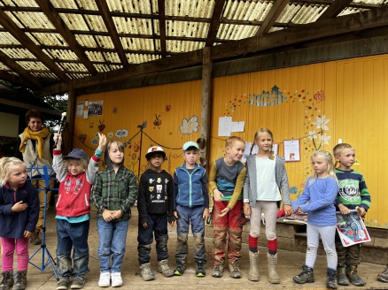 Kurz vor dem Start der Schulferien fand dann der sogenannte „Bärenabschied“ statt. Insgesamt elf große Bären verlassen unseren Kindergarten in diesem Sommer. Und, wie in jedem Jahr, gibt es den „Bärenabschiedstag“. Die Großen bringen ihre Schulranzen mit und präsentieren sie stolz im Morgenkreis, und sie wissen, dass sie heute ihre Portfolios, ihre „Erinnerungsbücher“, bekommen werden. Aber diese werden nicht einfach so überreicht. In einem kleinen Quiz müssen die Bärenkinder noch einmal ihr ganzes Können unter Beweis stellen. Selbstverständlich haben sie die Aufgaben problemlos gemeistert: Das Schubkarrenrennen wurde gegen Petra gewonnen. Silben klatschen - kein Problem. Malen können sie auch. Die anderen Kindern an ihren Stimmen erkennen ebenso und Tierspuren den richtigen Waldtieren zuordnen ist natürlich ein Kinderspiel. Sogar, das Löungswort „B Ä R E N“ konnten die zukünftigen Schulkindern bereits selbst lesen. Dann konnte es endlich an die Schatzsuche gehen. Wo hat sich der alte Koffer mit den Erinnerungsbüchern versteckt? Am nahen Jägerstand wurde der rote Luftballon entdeckt, in dessen Umkreis der Schatz verborgen lag. Die Waldwichtel sind gute Sucher und Finder und in kurzer Zeit war der Koffer unter einem Haufen Totholz gefunden. Und jetzt durfte endlich, beim Durchblättern der Bücher, in Erinnerungen geschwelgt werden: „Schaut, wie klein ich hier noch war“, „Da waren wir im Museum“, „Hier haben wir für Weihnachten gebacken“ und, und, und. Dick angefüllt sind die Bücher mit schönen Fotos, Kunstwerken, Liedern, Gedichten … Mit einem lachenden und einem weinenden Auge wird sich zurück erinnert. Aber die anstehende Schulzeit ist natürlich toll und spannend, und ein Besuch bei uns im Waldkindergarten jederzeit möglich!