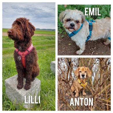 Ende des Monats gab es auch noch die „Hunde Stunde“. An diesem Tag bekamen wir Besuch von Martina Strobel und drei ihrer Hunde: Lilly, Anton und Emil. Wir haben uns schon sehr auf die vierbeinigen Besucher gefreut und waren ausgesprochen gespannt. Zuerst durften uns die Hunde begrüßen und beschnuppern und auch wir sagten ihnen freundlich, mit einem Leckerli in der Hand, „Hallo!“ . Dann stellten die Drei ihre guten Nasen unter Beweis. Sie fanden problemlos alle Leckerlis, die unter Bechern versteckt waren und genauso bravourös den Leckerlibeutel, der von uns gut versteckt wurde. Auch als sich Kinder auf dem Gelände, mitsamt dem Leckerlibeutel versteckten, wurden wir von Anton und Lilly in null Komma nichts, entdeckt. Bravo! Dann durften einige Waldwichtel die Hunde noch durch einen kleinen Parcours führen und zum Ende legten sich die mutigsten Waldwichtel, und das waren viele, ganz flach auf den Bauch und Anton und Emil, liefen über unsere Rücken, wie über eine Brücke. Uns hat die Stunde mit den Hunden so viel Spaß gemacht, dass wir sie auf jeden Fall sehr bald wieder einladen wollen!