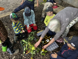Frau Schwarzburger hatte so einiges an spannendem Material im Gepäck: Pflanzen, die wir in unser kleines Beet setzen wollten, Modelle von Bienen und anderen Insekten. Sie erklärte die Entwicklung von der Blüte zur Frucht und welche Aufgabe hierbei die verschiedenen Insekten haben. Wir setzten gemeinsam einen Tee aus geschnittenen Zitronenmelissenblättern, Pfefferminze und Spitzwegerich an, den wir dann am Ende der gemeinsamen Aktion probiert konnten und allesamt waren wir der Meinung „Der Tee schmeckt toll!“. Am Ende des Vormittages sah unser kleines Beet wieder tipptopp aus. Die Erde frisch umgegraben und aufgelockert, bestückt mit einigen Erdbeerpflänzchen, Ringelblumen, Schafgarbe und der vorgezogenen Kürbispflanze, die Emil von Zuhause mitgebracht hatte. Ein toller Besuch und an dieser Stelle noch einmal ein großes Dankeschön an Frau Schwarzburger.