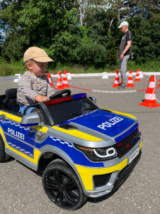 Währenddessen waren die jüngeren Waldwichtel am Parkplatz des Vereinsheimes und waren gespannt, was Herr Bechtel und seine Begleiterinnen von der Verkehrswacht im großen Bus so alles versteckt hatten. Ein Verkehrsparcours mit Ampel, Fußgängerampel und Zebrastreifen war bereits aufgebaut und einige kleine Bobbycars standen bereit. Und schon ging's los. Die Hälfte der Gruppe durfte „Auto“ fahren, die anderen waren Fußgänger. Und wir wissen Bescheid: Bei „rot“ stehen, bei „grün“ gehen/fahren. Das Highlight waren dann die beiden Elektro-Polizeiautos, die Herr Bechtel zum Ende der Stunde aus seinem Bus zauberte. Wir hatten Riesenspaß, aufs Gaspedal zu treten und den Parcours entlangzufahren. Ein toller Vormittag, an dessen Ende wir einander im Abschlusskreis ganz viel zu erzählen hatten.