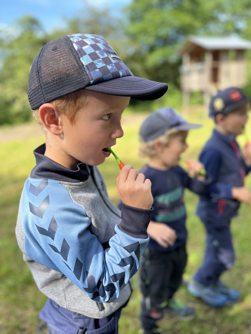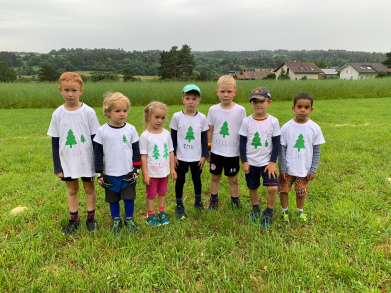 Vielleicht der Höhepunkt des Monats, war der „Fußball Krimi“, den wir Ende Juni erleben durften. Da es in diesem Kindergartenjahr viele begeisterte Fußballspieler gibt, dachten wir uns, passend zur Fußball EM, einen anderen Kindergarten zu einem Spiel einzuladen. Und wir wurden auch schnell fündig. Die „Eichhörnchen“ vom Naturkindergarten Gechingen, sagten sofort zu, gegen uns Waldwichtel anzutreten. Das Wetter passte am vergangenen Freitag - zwar nieselte es immer wieder ein klein wenig, aber es war nicht zu heiß - perfekt. Am Morgen wurde nochmals ein wenig trainiert, dann die extra gestalteten T-Shirts angezogen und auf das gegnerische Team gewartet. Pünktlich 11 Uhr waren die „Eichhörnchen“ vor Ort. Und sie hatten bereits eine sportliche Leistung hinter sich, denn sie waren von Gechingen bis zu uns gelaufen. Noch eine kleine Verschnaufpause für das Gechinger Team und dann wechselten wir rüber, zum Bolzplatz am Pumptrack. Das Spielfeld hatten wir markiert, zwei kleine Tore standen bereit. Wie die Profis liefen die beiden Teams auf den Platz und postierten sich für ein Gruppenfoto. Und dann ging's endlich los: Zweimal 15 Minuten Spielzeit. Zur Halbzeit stand es 4:1 für uns Waldwichtel. 10 Minuten Verschnaufpause und eine Brezelstärkung, dann ging's in die zweite Runde. Vielleicht wähnten wir Waldwichtel uns schon zu sehr als Sieger der Partie, weit gefehlt. Die Eichhörnchen gaben alles und das Spiel endete unentschieden 4:4. Nun hieß es Verlängerung, zweimal 3 Minuten. Doch kein Team konnte ein weiteres Tor erzielen. Also, 5 Meter schießen. Die Torhüter waren super und hielten jeweils 5 Schüsse. Doch dann spielte Julian von den Eichhörnchen, den Ball unhaltbar ins Waldwichtel Tor. Die Sieger standen fest und der Jubel der Gäste war groß. Die Enttäuschung bei den Waldwichtel ebenso, doch das Eis zum Abschluss des tollen Fußball Vormittages, tröstete schließlich über die knappe Niederlage hinweg.