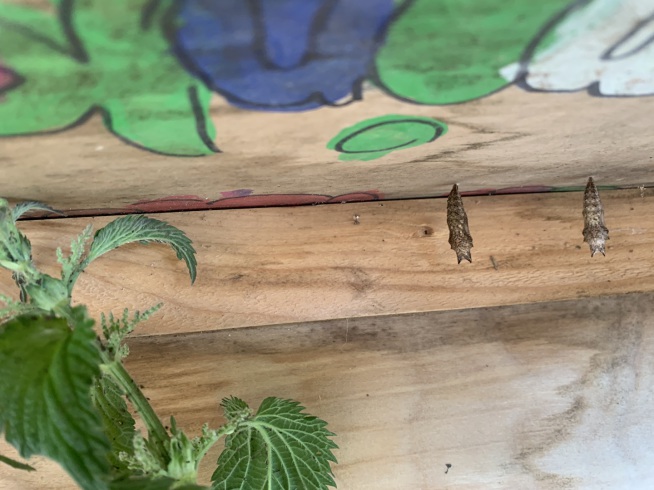 Wir wollen euch an dieser Stelle auch noch von unserem Schmetterlingskasten, den Raupen und ihrer Entwicklung zum Schmetterling, erzählen. Schon oft, haben wir im Monat April unseren selbstgebauten Schmetterlingskasten aus dem Schuppen geräumt und uns auf dem großen Brennnesselfeld auf dem Erdhügel, auf die Suche nach Schmetterlingsraupen gemacht. Und wir können sicher sein, auf dieser riesigen Futterstelle, hat garantiert ein „Kleiner Fuchs“, an die Unterseite eines Brennnesselblattes, seine Eier abgelegt. Im April sind dann, aus den winzig kleinen Eiern, bereits die Raupen geschlüpft, haben kräftig von den Brennnesseln gefuttert und sich bereits zu einer schönen Größe entwickelt. Dann, das wissen wir, ist es nicht mehr weit, bis sich die Raupe verpuppt und ins nächste Stadium ihrer Entwicklung zum Schmetterling, wechselt. So haben wir ein Wasserglas mit reichlich Brennnessel Futter bestückt und einige Raupen des „Kleinen Fuchses“ vom Erdhügel, in den Kasten umgezogen. Wir konnten beobachten, wie die Raupen noch einige Tage gefressen haben und sich dann, mit ihrem Popo, an die Decke des Kastens gehängt haben, bereit, sich zu verpuppen. Leider konnten wir diesen besonderen Moment bei keiner der Raupen live erleben: Wenn die Raupe ihre Raupenhülle abstreift und dann als „Puppe“ am Kastendeckel hängt. Dann hieß es warten, warten, warten … Denn das nasse, kühle Wetter im Mai, hat dazu beigetragen, dass die ersten Tagfalter erst Anfang Juni geschlüpft sind. Und tatsächlich, konnten wir das Entschlüpfen aus der engen Puppenhülle, bei einem Schmetterling beobachten. Dies geschieht immer nur an einem sonnig warmen Tag. Ganz langsam schälte sich der Falter aus der Hülle, entfaltete langsam seine Flügel, streckte, reckte sich, ließ sich ausgiebig von der warmen Junisonne wärmen und flatterte dann in den blauen Himmel davon. Seht euch die Fotos an, dann könnt ihr ein wenig am tollen Erlebnis teilhaben!