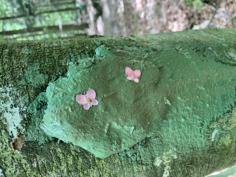 Nach einem nassen Monat Mai, hat sich zumindest der Start in den Juni nach Sommer angefühlt. Und ihr glaubt nicht, wie schön so ein Sommervormittag im Nächstenwald sein kann. Solch einen idyllischen Vormittag haben die kleinen Rabenkinder letzen Donnerstag am Eulenplatz erlebt. Donnerstags finden bei uns Waldwichtel immer die „altershomogenen“ Gruppen statt. Das heißt, die Kleinen, Mittleren und Großen verbringen, nach der Vesperzeit, etwa eine Stunde „unter sich“. Mit einem Angebot, das ihrem Alter und ihren Wünschen entspricht. Und so hat sich die Rabengruppe, die kleinsten Waldwichteln, samt voll bepacktem Bollerwagen, zum Eulenplatz verabschiedet. Im Gepäck: Eimer, Schaufeln, Feilen, große Pinsel, Erdpigmente, Kreiden, Wasser und kleine Edelsteinchen, die Elfi uns mitgebracht hatte. Am Eulenplatz gab es dann das Wichtigste, nämlich wunderbar feuchte, lehmige Erde. Dank des vielen Regens ist der Waldboden nun nämlich endlich wieder mal richtig gut durchnässt. Und dann ging’s los: Es wurde Lehm mit Erdfarben gemischt, Kreiden zu feinem Staub gefeilt, Lehm in Wasser gerührt, an Bäme geklebt, mit Edelsteinen bestückt … Die fünf Rabenkinder arbeiteten so intensiv und versunken, die Vögel zwitscherten und die Sonnenstrahlen fielen durch die dicht belaubten Bäume zu uns herein. Ein wunderbares Waldbaden.