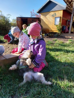 Seit diesem Monat gibt es zum Pferdeprojekt auch das „Hundeprojekt“. Martina Strobel hat uns mit ihren Hunden Fiete, Lilli und Ida besucht und fünf Waldwichteln waren an diesem ersten „Hunde Tag“ mit von der Partie. Das Thema war: Wie „spricht“ ein Hund? Wie können wir aus dem Verhalten, der Körpersprache des Hundes, seine Stimmung erkennen? Wie können wir uns, ebenfalls durch Körpersprache, dem Hund verständlich machen? Natürlich hatte jedes Kind auch die Möglichkeit einen Hund an der Leine zu führen, das macht stets besonders viel Spaß, und es gab lustige Suchspiele mit Bechern, bei denen die Vierbeiner ihre hervorragenden Nasen unter Beweis stellen konnten.