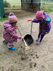 Beim zweiten Spiel halfen wir Angela ein wenig beim Misten. Zwei kleine Haufen Pferdeäpfel warteten darauf mit Rechen und Schaufel aufgekehrt, in eine Schubkarre geschüttet und dann in einen Eimer geleert zu werden. Wieder ging es in zwei Gruppen um die Wette.