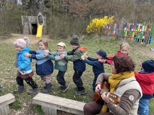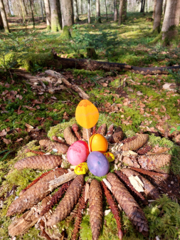 Ein paar Tage später fand dann auch unsere Osterfeier statt. Tags zuvor hatten wir bei „Hexe Tannenmütterchen“ unsere Nester gerichtet. Immer zwei Kinder bauten gemeinsam ein kreatives Nest am Waldboden - aus Moos, Fichtenzapfen, kleinen Ästchen …. Wunderschön. Jedes Nest war mit einem Stecker versehen, auf dem die Namen der beiden Kinder standen, so dass der Osterhase, der tags darauf, hoffentlich, zu uns kommen würde, die Nestchen auch sicher nicht übersehen würde. Und er hat sie nicht übersehen. Dank unseres Lageplanes, der ihm genau aufzeigte, wie er vom Bauwagenplatz zum Platz „Hexe Tannenmütterchen“ findet, konnte nichts schiefgehen.