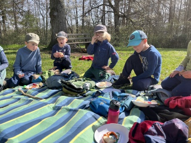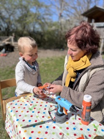 Und an der Karotte, die wir ihm zum gezeichneten Lageplan gehängt hatten, hat er sich gestärkt (die Bissspuren haben es bewiesen). Die Freude war groß, als wir die gefüllten Nester entdeckten. Dazu schien die Sonne und wir hatten einen fröhlichen Frühlingstag, mit Spiel und Spaß und einem köstlichen Buffet, zu dem jede Familie etwas beigetragen hat.