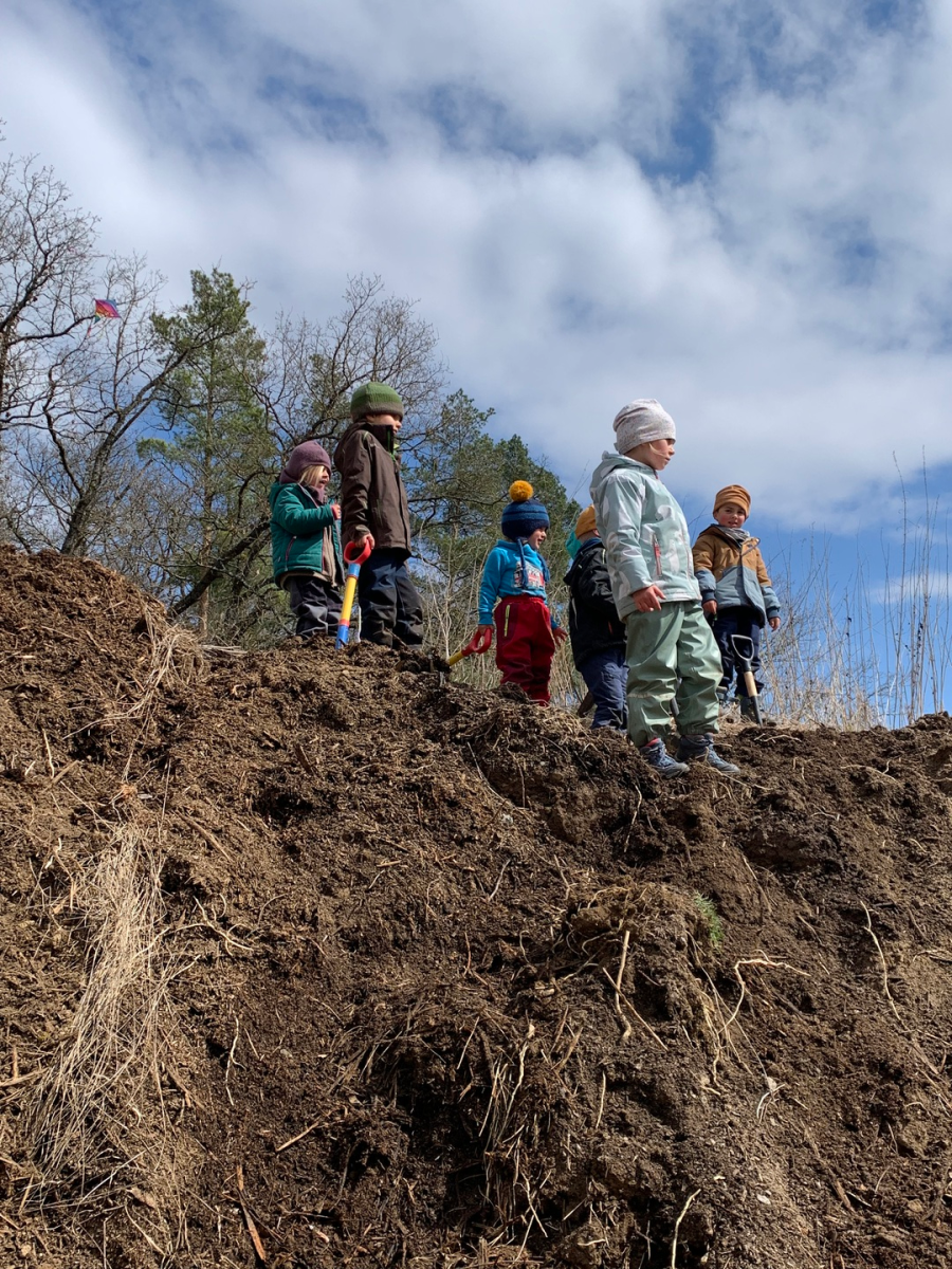 Immer wieder wird hier Erde an- und abtransportiert, das heißt, die Form des „Erdhügels“ ändert sich laufend. Wir Waldwichtel lieben diesen großen Erdhaufen und genießen es unheimlich, wenn wir darauf spielen dürfen.