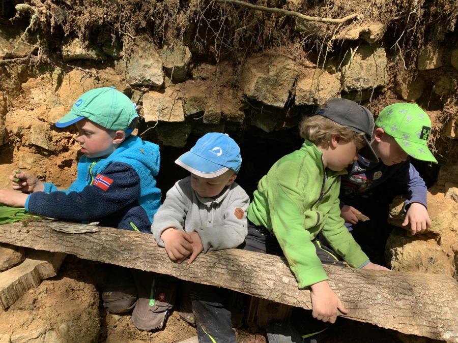 Von dort ist es schöner Spaziergang in den nahen Wald, bis zu einer Stelle an dem früher wohl Steine abgebaut wurden. Dort kann man wunderbar spielen, ein wenig klettern und wir fühlen uns dann fast wie Bergsteiger.