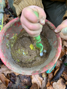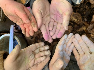 Erde in einen Eimer geben, etwas Wasser dazu und dann, mit Hilfe einer groben Feile, noch bunte Kreide dazu gerieben - wunderbar!