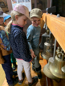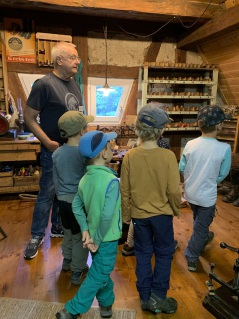 Und dann waren die vier zukünftigen Schulkinder auch noch zu Besuch im Heimatmuseum „Appeleshof“ in Gechingen. Schon seit vier Jahren haben die ältesten Waldwichtel, die Gelegenheit, von Norbert Jensen, durch das absolut lebendige Museum geführt zu werden und zu erleben, wie die Menschen vor 100 Jahren in einem Gechinger Bauernhaus gelebt haben: zu bestaunen gibt es alte Arbeitsgeräte, Wohnräume, wie Küche, Wohnzimmer, Schlafzimmer. Wie sahen die Uniform und die Werkzeuge der damaligen Feuerwehr aus? Wie gewannen die Menschen die Leinfasern, die dann auf dem Webstuhl zu Stoff und anschließend zu Kleidung verarbeitet wurden.