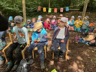Alle vier hatten ihre Schulranzen dabei, die sie stolz im Morgenkreis präsentiert haben. Nach dem Essen fand das „Bärenabschied Spiel“ statt, bei dem sie, mit Unterstützung der anderen Waldwichtel, sechs Aufgaben zu erfüllen hatten, bevor sie den Schatzkoffer suchen mussten, in denen die heiß ersehnten Erinnerungsbücher versteckt waren. Gespickt mit vielen Erinnerungen, wie Fotos, Liedtexten, Monatsberichten … sind sie ein wunderbarer Rückblick auf die Jahre im Waldkindergarten. Selbstverständlich haben die Vier, alle Aufgaben hervorragend gemeistert und den Koffer, Dank ihrer perfekten Spürnasen, sehr schnell im Wald gefunden. Und dann konnte, beim Blättern durch die Portfolios, ausgiebigst in alten Erinnerungen geschwelgt werden: „Da waren wir im Theater …!“, „Das war an Fasching …!“, „Das war ein ganz heißer Tag, ich erinnere mich …!“. Auch die Igel und Raben Waldwichtel, die nun davon träumen, wie es sein wird, selbst das Erinnerungsbuch in den Händen zu halten, haben eine Überraschung von den großen Bären und ihren Familien bekommen: eine tolle Murmelbahn, selbst gebaut, plus eine spezielle Popcorn Pfanne für die Feuerschale - toll! Wir haben uns riesig gefreut und freuen uns auch, wenn die Vier ab und an bei uns vorbei schauen.