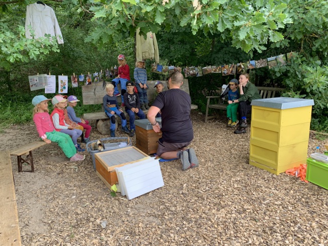 Zum Ende des Monats hatten wir Besuch von Imker Manuel aus Gärtringen. Mit großem Gepäck war er angereist - mit dabei alles, was ein Imker für seine Arbeit benötigt. Der große Kasten, die sogenannte „Beute“, darin zu finden waren der Brut- und Honigraum, eine alte, ausgebaute Wabe, in der wir noch Futterreste und Pollen sehen konnten. Außerdem den Smoker, Stockmeisel und Besen. Dazu noch viele spannende Fotos rund um die Bienenarbeit. Wir konnten viele Fragen stellen, die uns auf der Zunge brannten: Wie feiert eine Biene Hochzeit? Warum ist die Bienenkönigin größer? Wieviele Babys bekommt sie, bzw. wie viele Eier legt sie (täglich)? Wie alt werden Bienen? Hat die Biene Feinde? Welche Aufgaben hat eigentlich der Imker? Und Manuel hat uns mit viel Freude alle Fragen beantwortet.