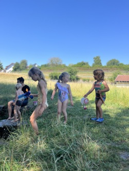 Die letzten beiden Junitage hat der Sommer aus dem Vollen geschöpft. Es war heiß, richtig heiß. Und so wir haben überlegt, wie wir diese ersten hochsommerlichen Tage gut überstehen könnten. Die Lösung war einfach - mit ausreichend Plantschmöglichkeiten. Und deshalb ging es an einem der Hitzetage zu unserer Lieblingsbachstelle nach Gechingen. Mit dem Bus bis zum Gechinger Rathaus und dann noch ein Stück zu Fuß. Dort konnten wir den heißen Tag hervorragend aushalten, denn das Wasser war wunderbar kühl. Dazu noch ein Eis zum Ende des Kindergartentages - was will man mehr!