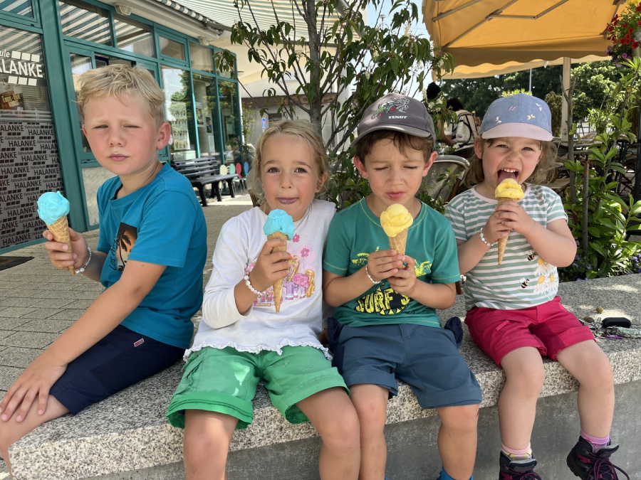 In der zweiten Woche der Pfingstferien, die in den Monat Juni fielen, waren viele Waldwichtel auf Reisen. Das Wetter war schön und wir „Zuhausegebliebenen“ hatten Lust, auch ein wenig unterwegs zu sein. Und so haben wir verschiedene Spielplätze in der nahen Umgebung besucht. An einem Tag ging es nach Gechingen zum Spielplatz am Falkenweg. Und am Tag darauf fuhren wir mit der S-Bahn von Gärtringen nach Herrenberg, um dort zuerst den Spielplatz am „Oberen Zwinger“ und anschließend den Spielplatz am „Otto'schen Garten“ zu besuchen. Zwischendurch gab es einen Stop in der Eisdiele. Wir waren unterwegs, haben viel gesehen, hatten Besuch von einigen ehemaligen Waldwichteln, wir konnten klettern, balancieren, rutschen und schaukeln, ein Eis genießen - kurzum wir hatten zwei tolle Vormittage. Aber wir freuen uns, wenn nach den Ferien, die Waldwichtel von nah und fern Zuhause angekommen sind und wir alle gemeinsam wieder im Nächstenwald unterwegs sind.