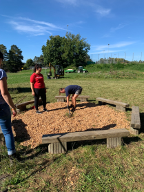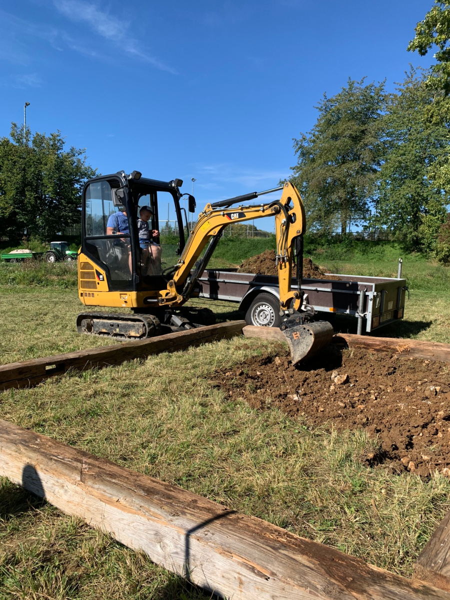 Und nachdem dieses montiert war, konnte auch der Rest umziehen: Morgenkreis, Sandkasten, Stelzenhaus, Matschküche, Wichtelzaun. Und wenn viele fleißige Hände gemeinsam anpacken, funktioniert das ganz wunderbar. So wurde, unter blauem Spätsommerhimmel, kräftig gebaggert und gesägt, gebohrt und gewuchtet, gemäht und gehämmert.