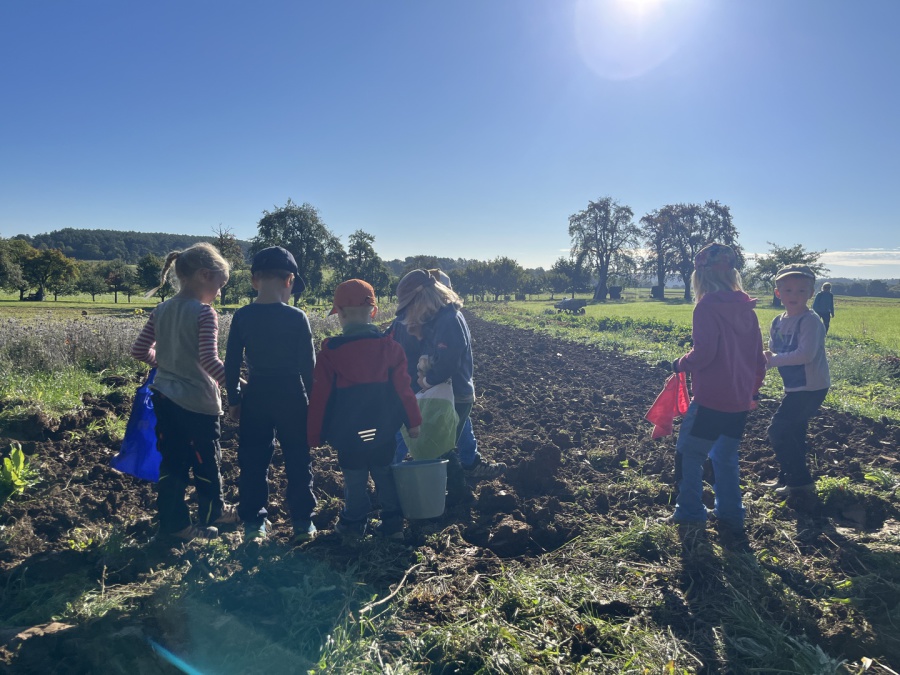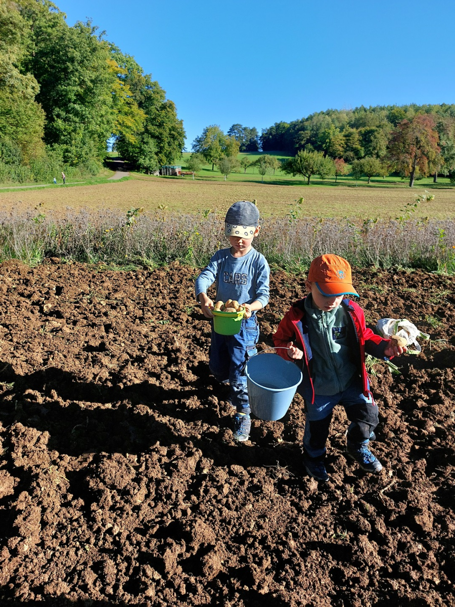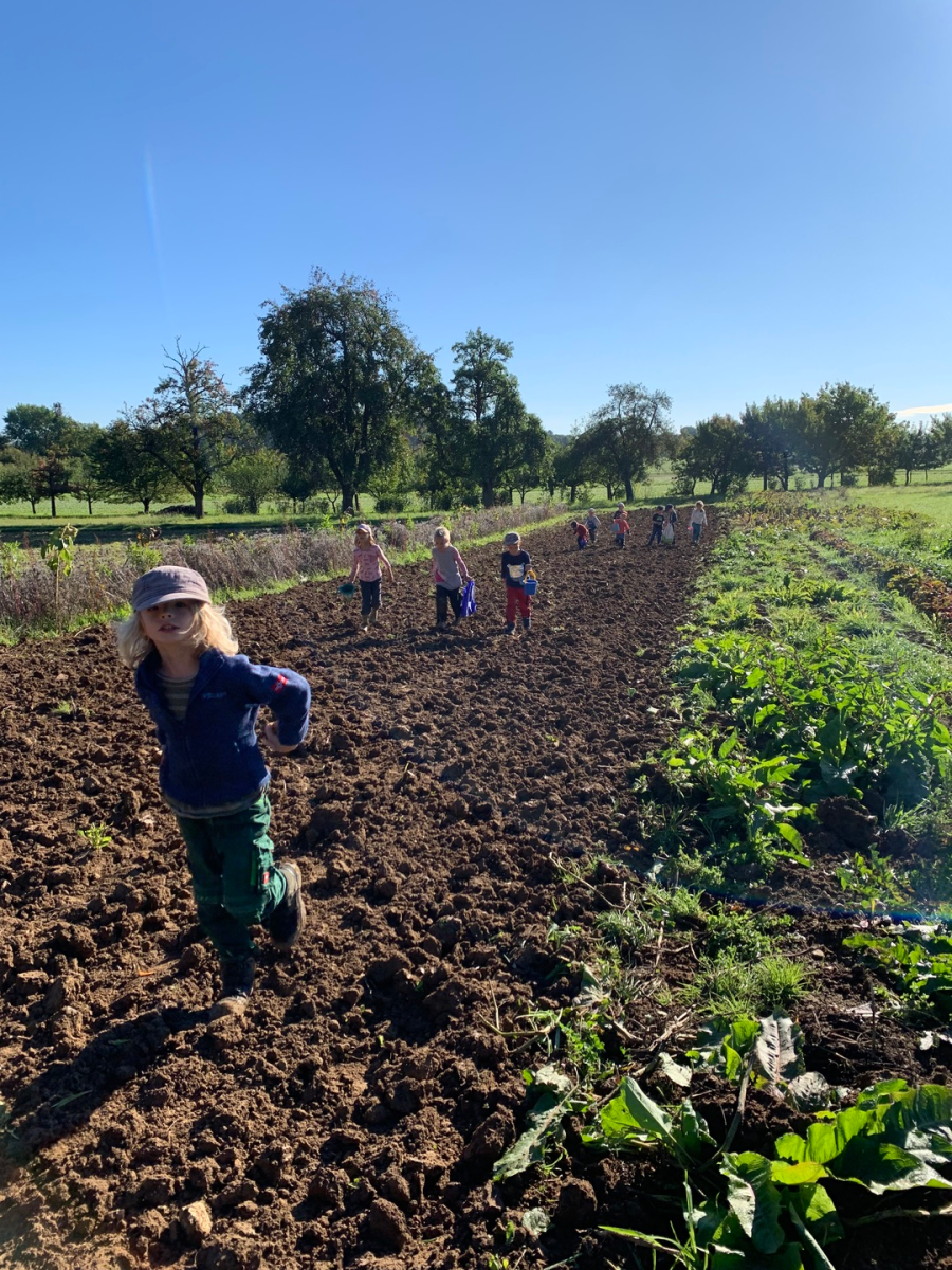 An einem Septembertag, an dem die Sonne vom blauen Himmel schien, ging’s auf zur Kartoffelernte. Denn der September ist bei uns auf jeden Fall der Erntemonat. Und da wir das große Glück haben, dass Jakobs Onkel Christian der Waldeckhof gehört, und Christian auch Kartoffeln anbaut, konnten wir dort die liegen gebliebenen Kartoffeln vom Acker aufsammeln. Wir haben uns mächtig drauf gefreut und hatten einen Heidenspaß, mit unseren Eimerchen über den Acker zu stiefeln und all die vergessenen Kartoffeln aufzusammeln.
