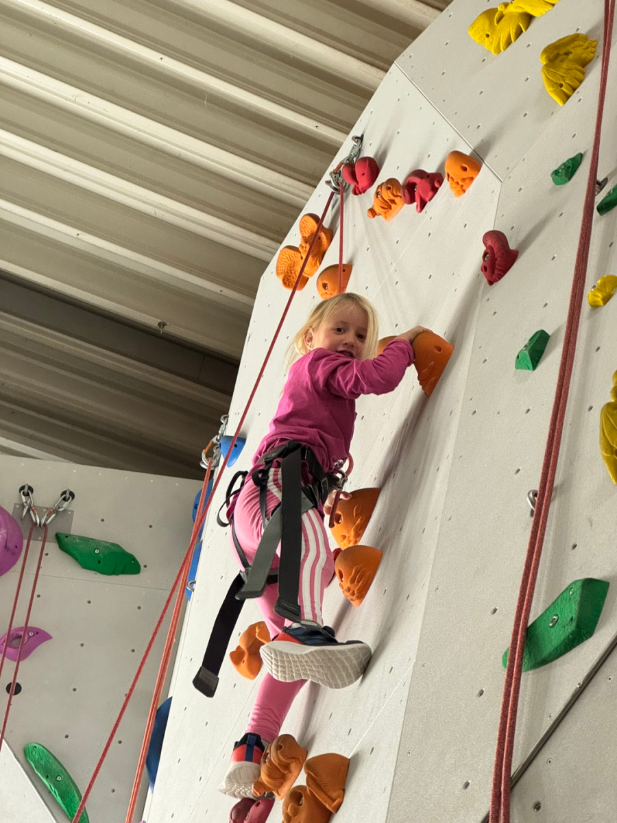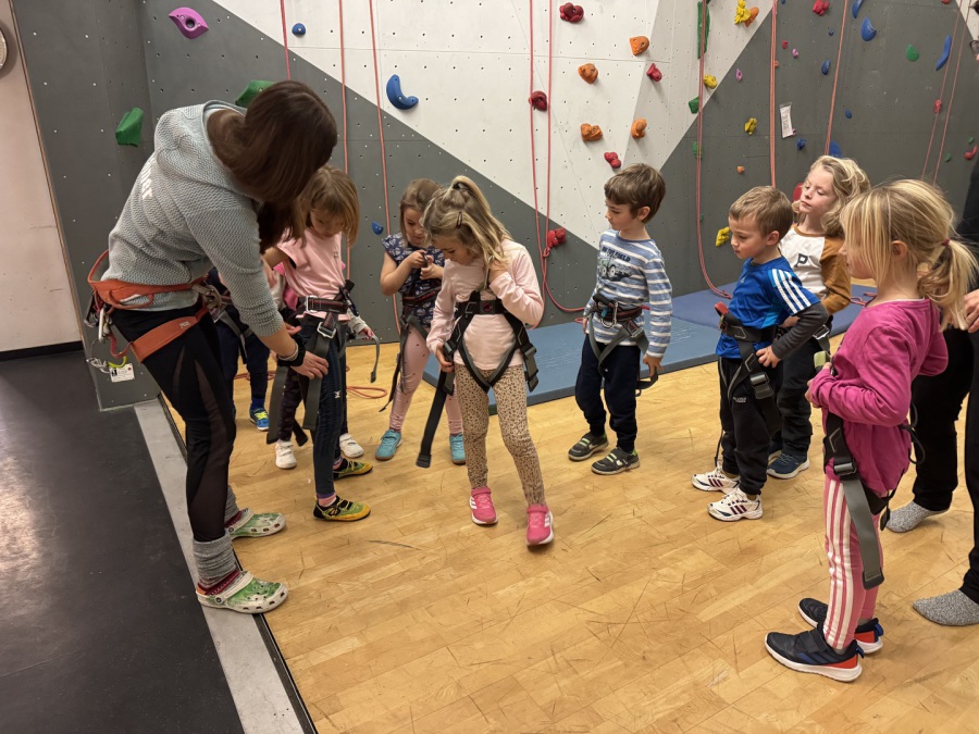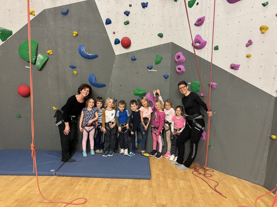 Jetzt war es nur noch ein Katzensprung ins Pink Power, wo die tolle Kletterhalle auf uns wartete. Aber bevor es in die Klettergurte ging, wurde gevespert und dann konnte es losgehen. Mit einem Aufwärmspiel, unter der Anleitung von Klettertrainerin Nicole, wärmten wir Arme und Beine auf, um dann in die Klettergurte zu steigen. Wir hatten riesig viel Spaß beim Klettern an der 10 m hohe Wand und viel zu schnell waren die 90 Minuten um. Herzlichen Dank an Nicole für die tolle Anleitung und Begleitung.